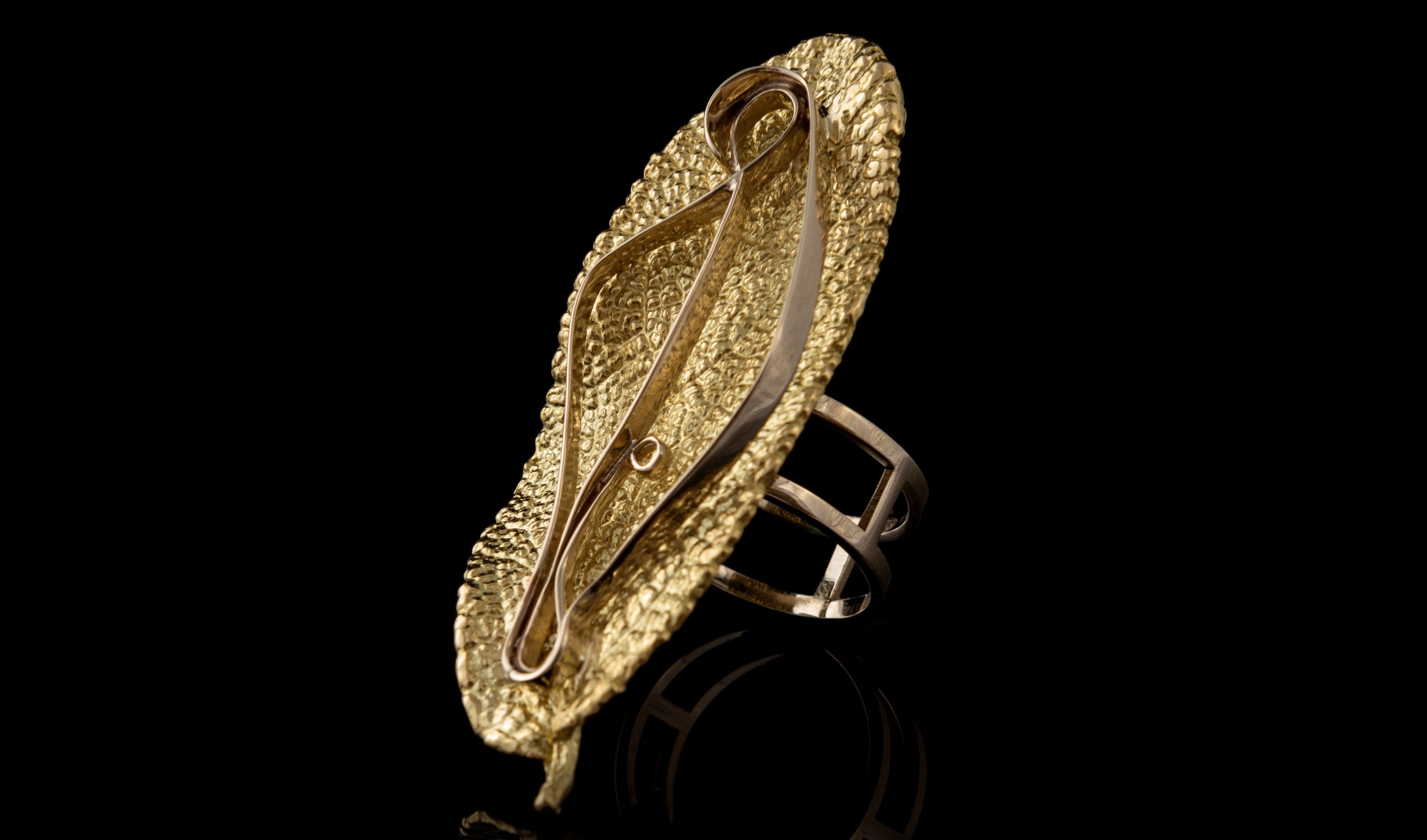 Inside the gallery, the intention and complexity behind each piece is breathtaking. Grant presented Wallace Chan’s beautiful tsavorite garnet Spring of Life ring featuring a frog holding a diamond-set pearl for the guests. “It is made from titanium, but the blue column down the side is porcelain. Wallace Chan invented a porcelain that is five times stronger than steel, yet it is still very light.”