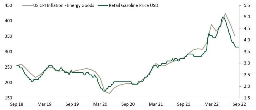 We argued last quarter that “the signs suggest many pandemic-related inflationary factors such as elevated demand for goods and supply chain disruption are much improved”. Despite some surprisingly high readings over the summer, this statement continues to be backed by the evidence. A c.25% fall in gasoline prices since the middle of June has helped (see chart), but the main reason to expect subsiding inflation in the months to come is the resolution to last year’s supply chain disruption.
